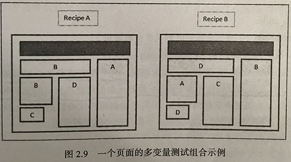 缺点:因为需要许多不同的测试组合,所以多变量测试通常基于测试版本组合(称为配方——recipe)的采样(部分因子),这可能导致你遗漏某些最佳的元素组合。