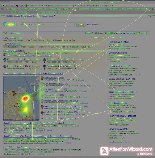用于理解访问者视线流的第一个工具来自Gazehawk,另一个较为简单的视线流工具来自Attention Wizard(上面的示例图就取自该工具)。