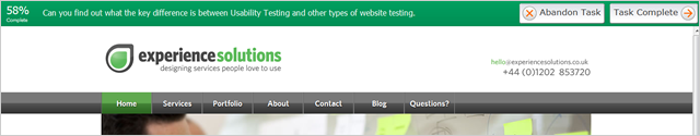 2、Loop11可以比UserTesting便宜得多价格获得许多任务完成反馈。访问者也没有必要安装任何程序,就可以回答你的任务完成问题;他们只是看到一个弹出窗口询问他们是否愿意参与网站顶部的一个横栏显示需要他们回复的任务。