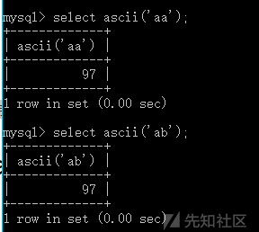 返回字符串str的最左字符的数值。返回0,如果str为空字符串。返回NULL,如果str为NULL。 ASCII()返回数值是从0到255;