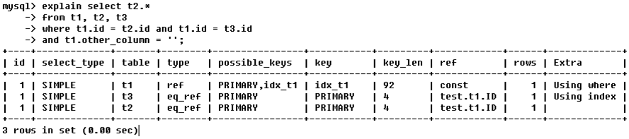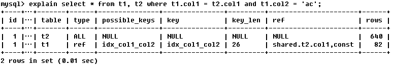 注:由key_len可知t1表的idx_col1_col2被充分使用,col1匹配t2表的col1,col2匹配了一个常量,即 'ac'