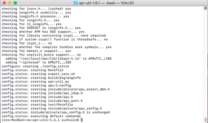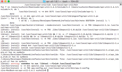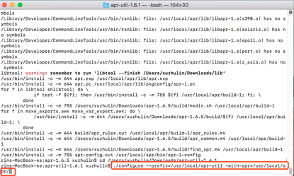 安装好了apr之后,我们再接着刚刚报错没安装好的apr-util,跟上面的操作步骤其实差不多,cd 进入到apr-util解压后的文件夹所在路径,enter回车,输入命令: ./configure --prefix=/usr/local/apr-util -with-apr=/usr/local/apr/,再enter回车等命令执行结束,页面如下:
