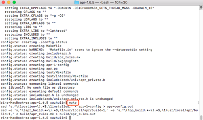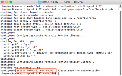 不要慌,这个时候就需要先安装apr,因为apr-util的安装包是依赖于apr的,那接下来就cd 进入到apr解压后所在的文件夹路径,enter回车,再输入这句命令:./configure --prefix=/usr/local/apr,再enter回车,等命令执行完毕,页面如下:
