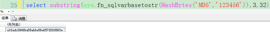 select substring(sys.fn_sqlvarbasetostr(HASHBYTES('MD5','123456')),3,32)