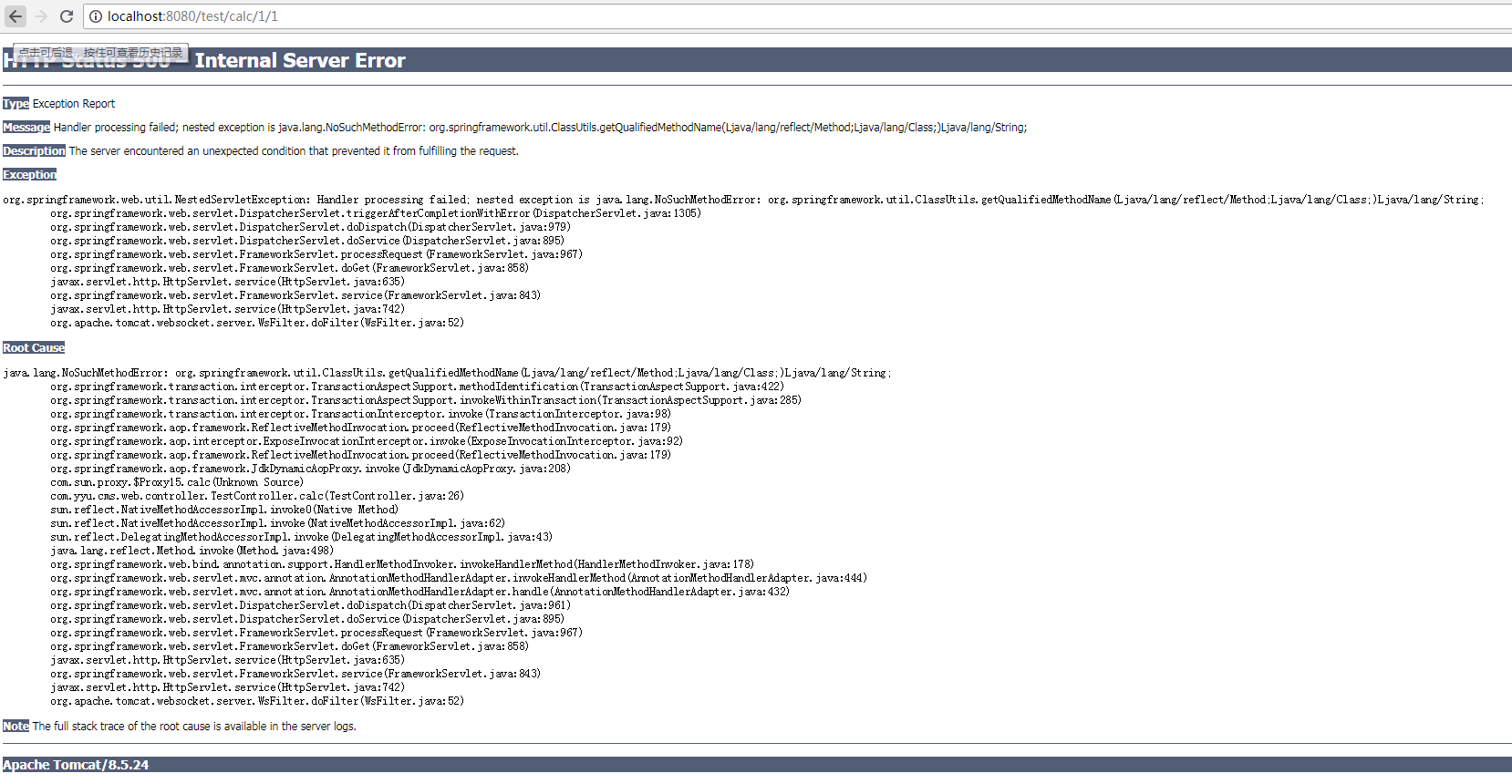 之前由于appcms-dao层的spring-jdbc的版本为5.1.3.RELEASE,spring的版本为4.2.6.RELEASE,spring-jdbc的版本过高,导致jar包兼容问题,访问http://localhost:8080/test/calc/1/1报错,出现以下错误,具体参考https://blog.csdn.net/z4331016/article/details/78257165