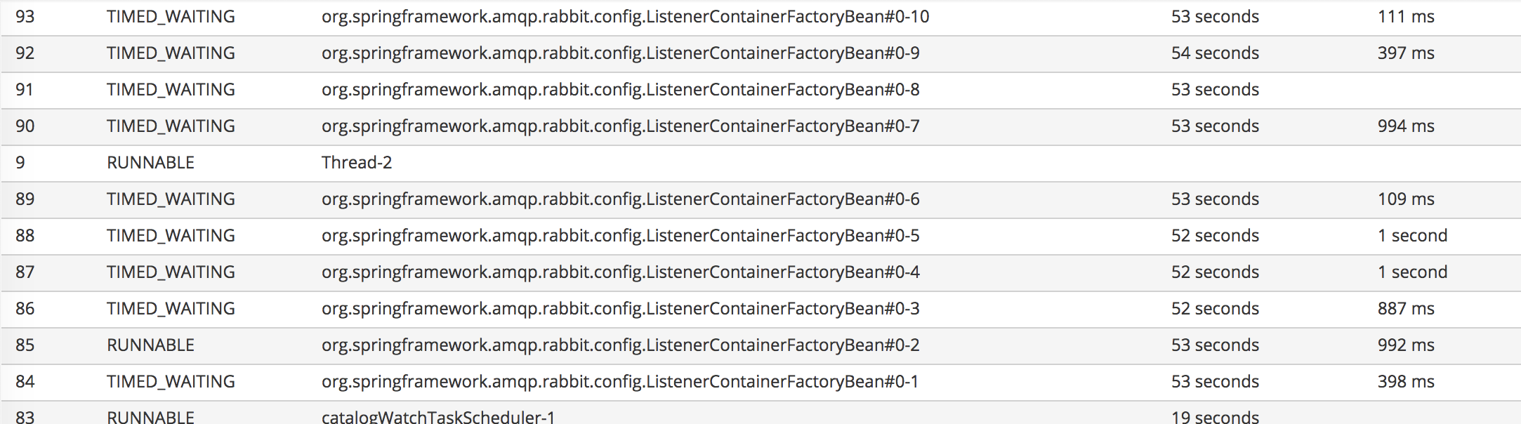 项目里用到了十个线程去消费 MQ的数据,但是openshift上面可以看出,每次只有一个线程在处理,而且会出现Blocked的情况: