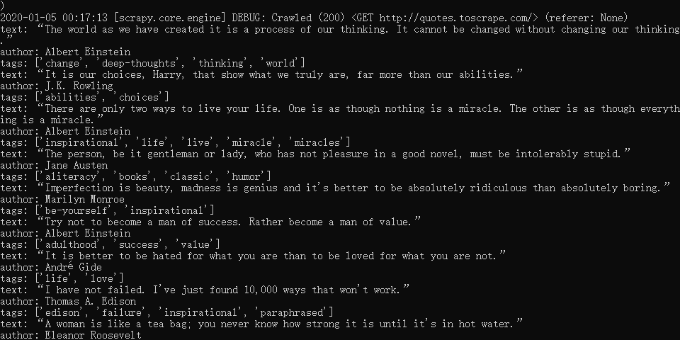 除了我们 print() 中的内容的打印,还可以看到在 Scrapy 启动的过程中, Scrapy 输出了当前的版本号以及正在启动的项目名称,并且在爬取网页的过程中,首先访问了 http://quotes.toscrape.com/robots.txt 机器人协议,虽然这个协议在当前这个示例中响应了 404的状态码,但是 Scrapy 会根据机器人协议中的内容进行爬取。