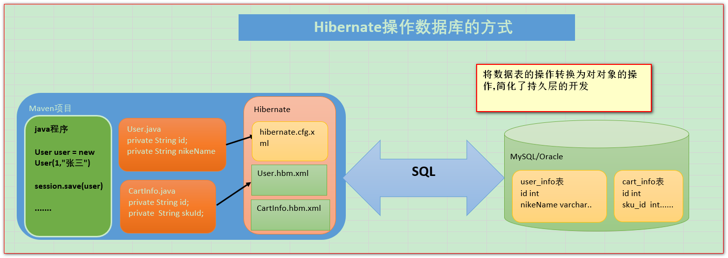 简单的工作封装交给我来做,所以说,这对于Hibernate来说是致命的,因为Hibenate将对表的操作转换为对对象的操作,只需通过操作对象就能帮助我们发送SQL,这是它本身最大的特点优势。