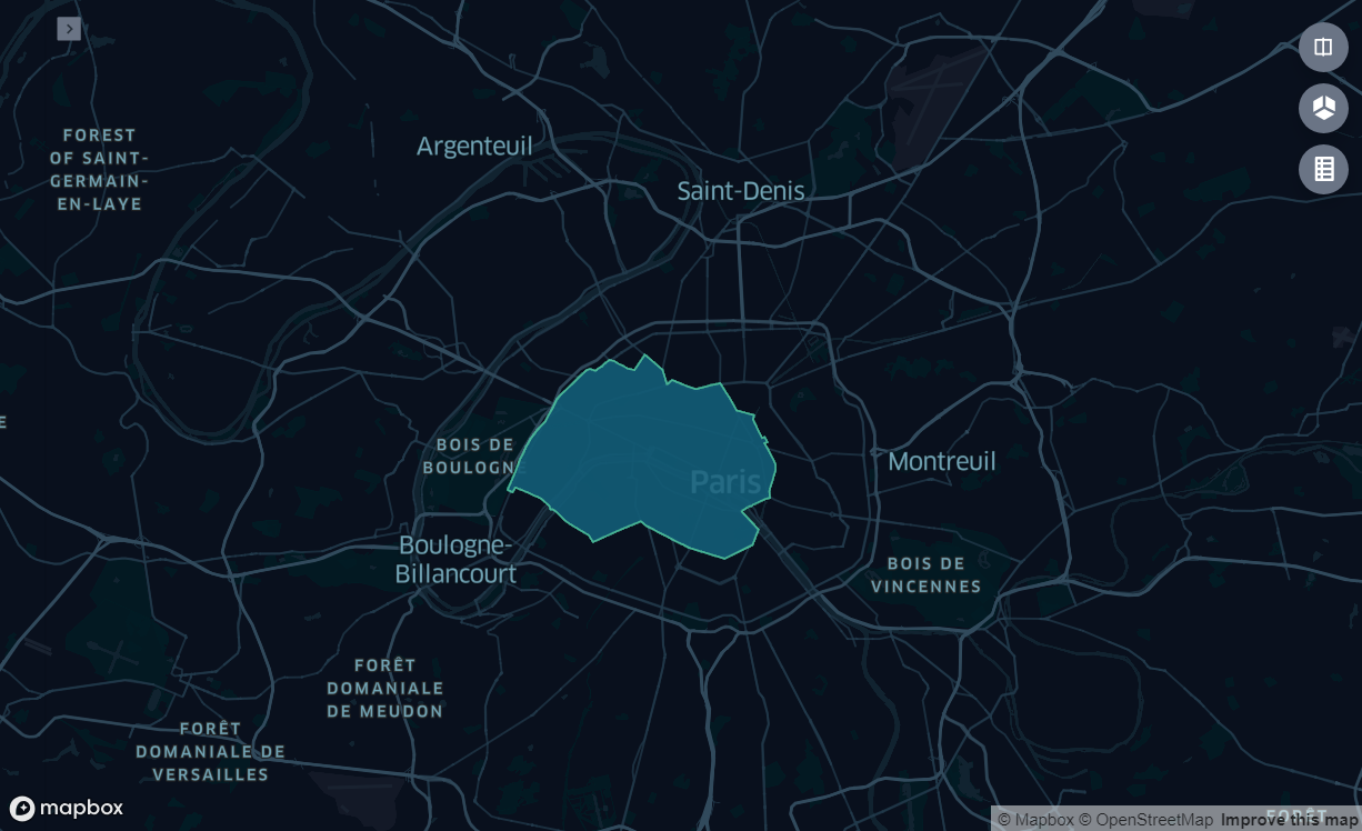 geojson文件是kepler.gl中使用起来最方便的一种数据格式,因为它格式清楚,kepler.gl可以直接推理出需要执行的可视化方案,下面这个例子使用到kepler.gl所属的github下notebooks文件下的geojson-data.json,这个geojson文件记录了位于巴黎的一个多边形的矢量信息: