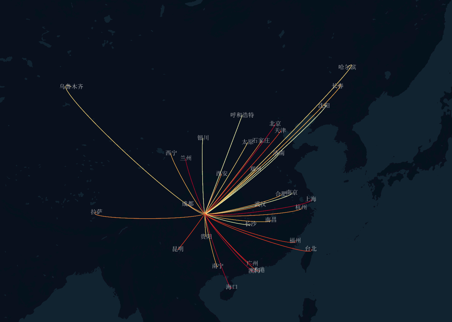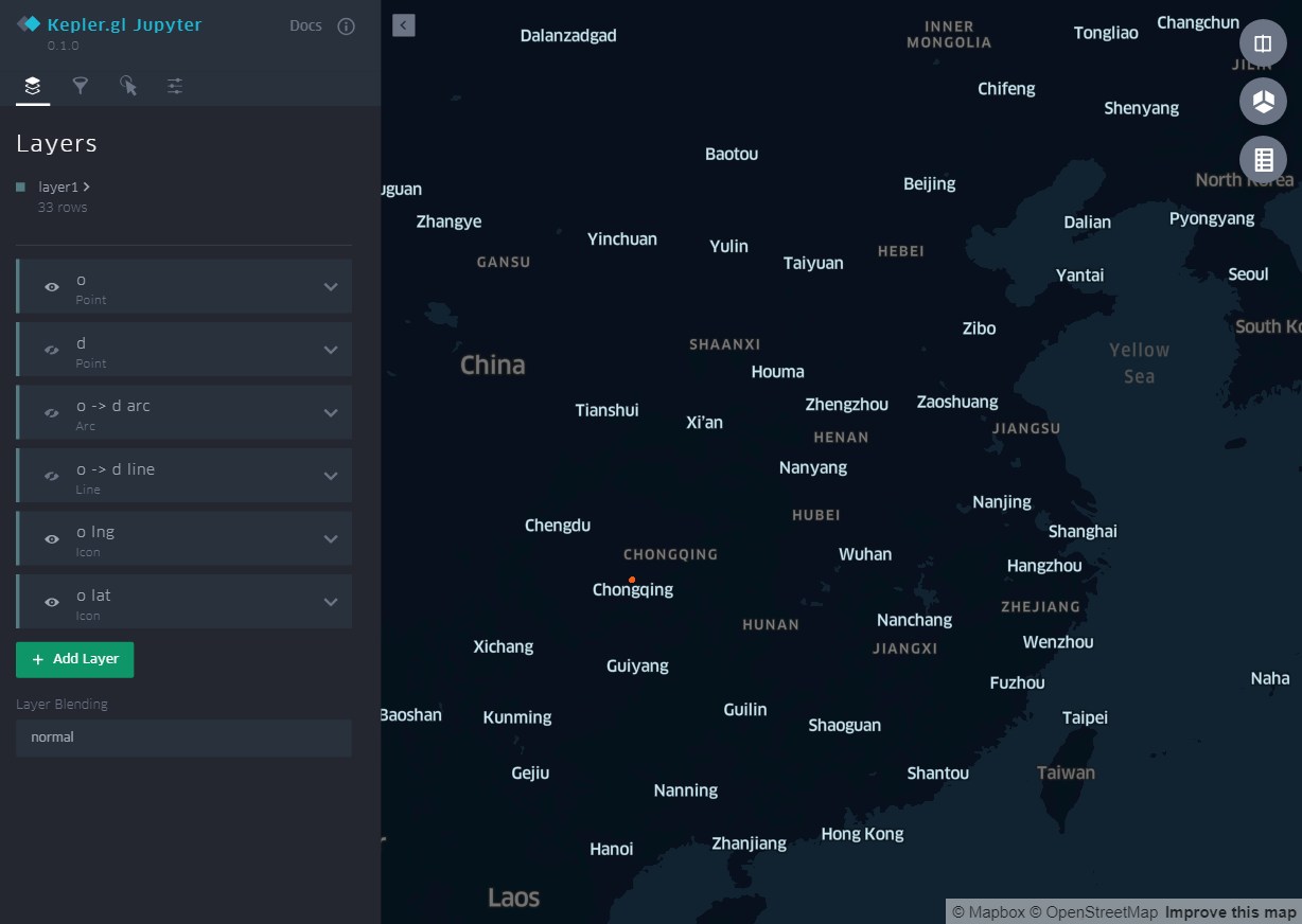 第一个按钮下包含了跟图层元素相关的众多功能,要使用这些功能需要导入数据,利用add_data()方法传入,它有两个参数,data用于传入包含要传入图层的所有数据信息(具体的格式下一章节中会做具体介绍),name传入字符串类型的变量,用于给当前图层命名,默认为'unnamed',下面我们以一个简单的飞线图的示例来初步认识利用kepler.gl进行可视化的基本流程:
