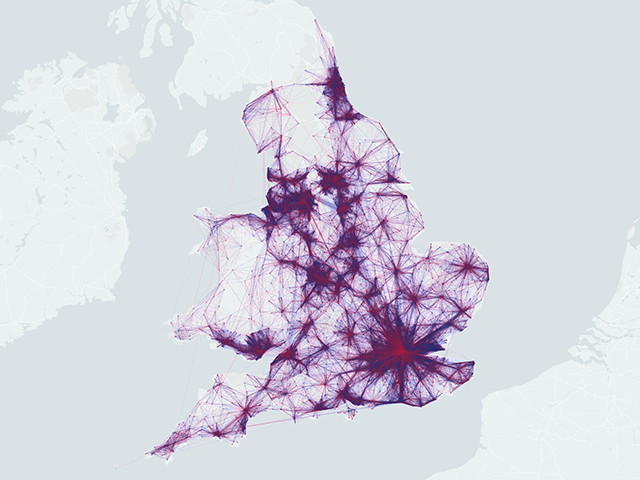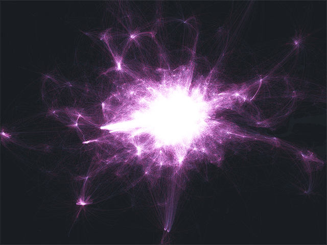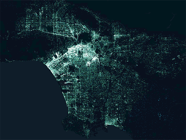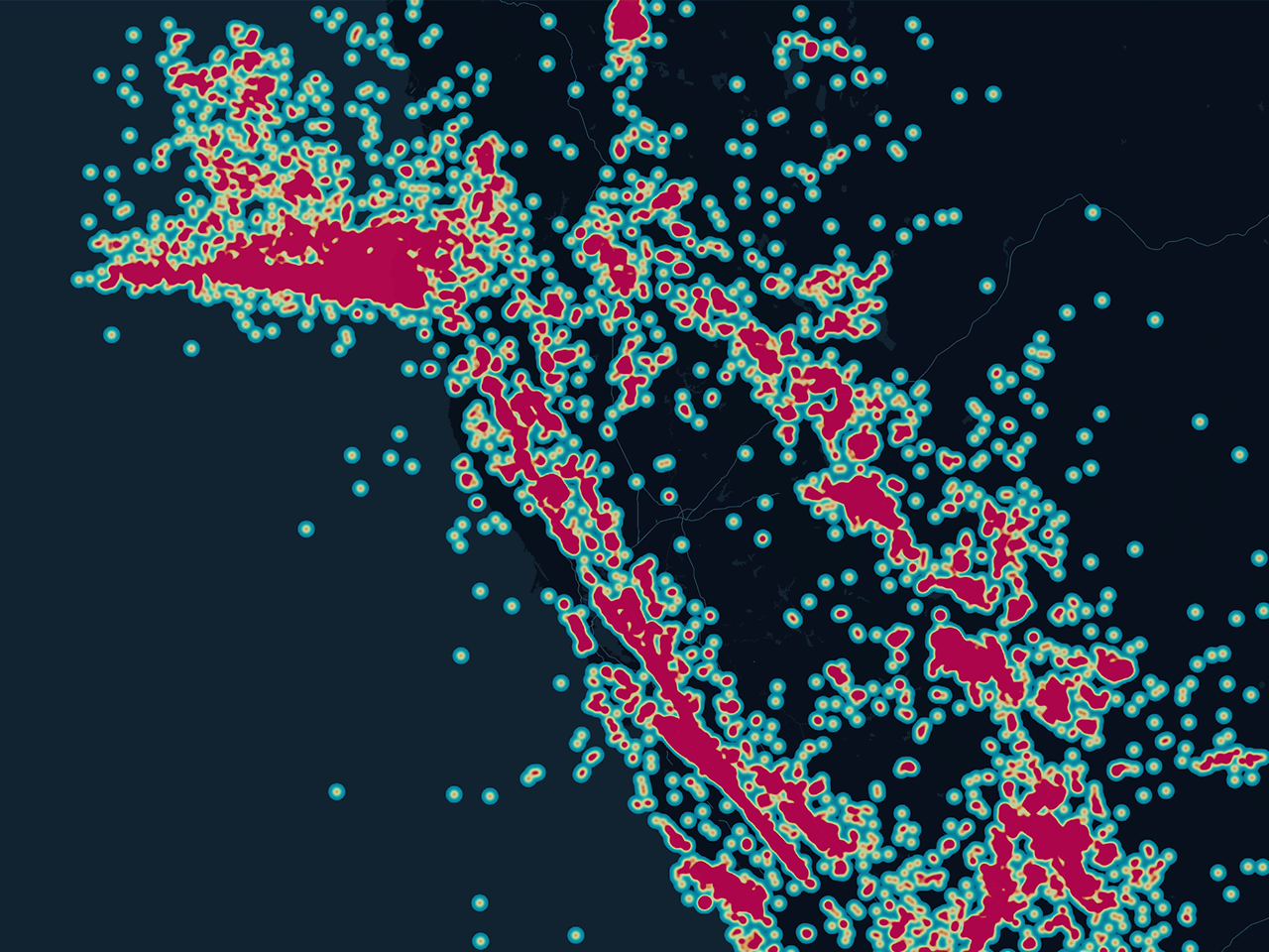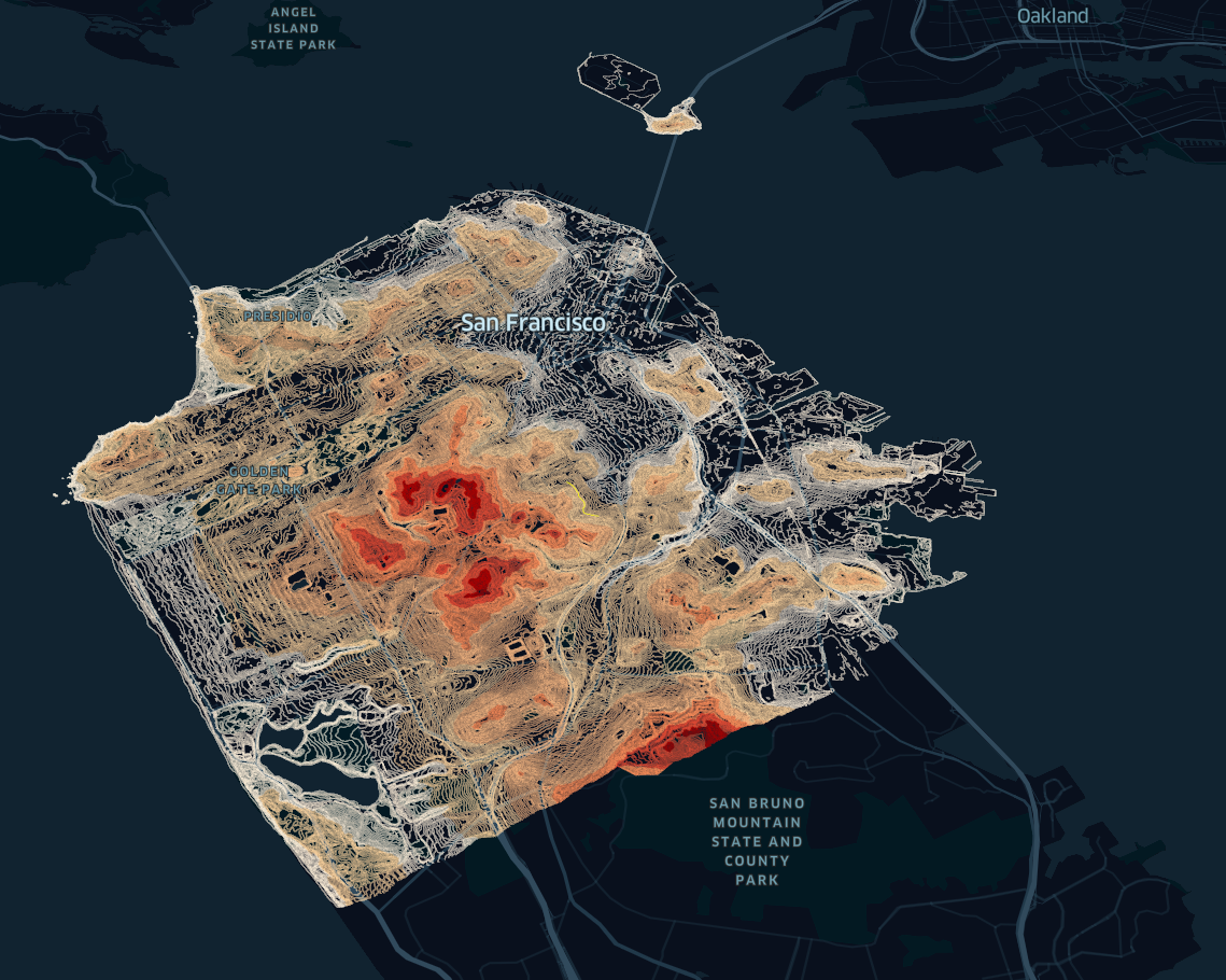 skpler.gl会对csv格式的文件的字段类型进行推断,一定要在代表经纬度信息的字段名称中加上对应的lat、lng部分,否则导入数据后并不能自动识别为可能的图形对象,skpler.gl中主要用手动的方式来调整显示哪些对象、以什么格式显示,通过一番简单的手动调整我们得到下面的图像: