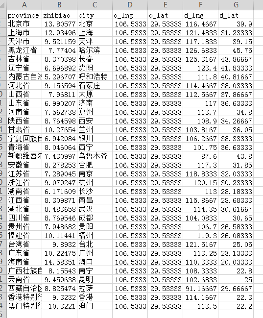 使用到的数据是随机生成的,除经纬度和地名外其它字段真实之外其他字段无意义,保存在datatable.csv中,具体如下: