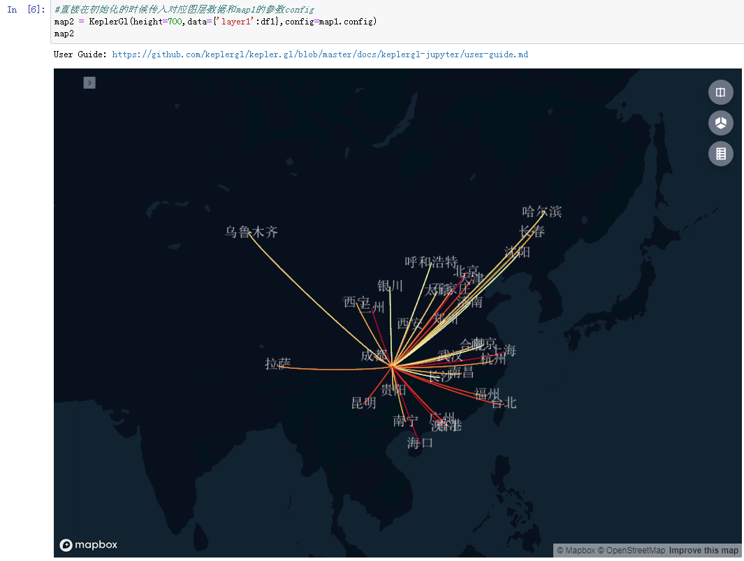可以看到通过这种方式我们直接一步就还原了之前完成的可视化结果,通过本小节中这个简单的小例子,你应该对jupyter notebook中如何调用kepler.gl有了一个初步的认识,接下来我们在不同的例子中总结传入不同格式数据进行可视化的方法。