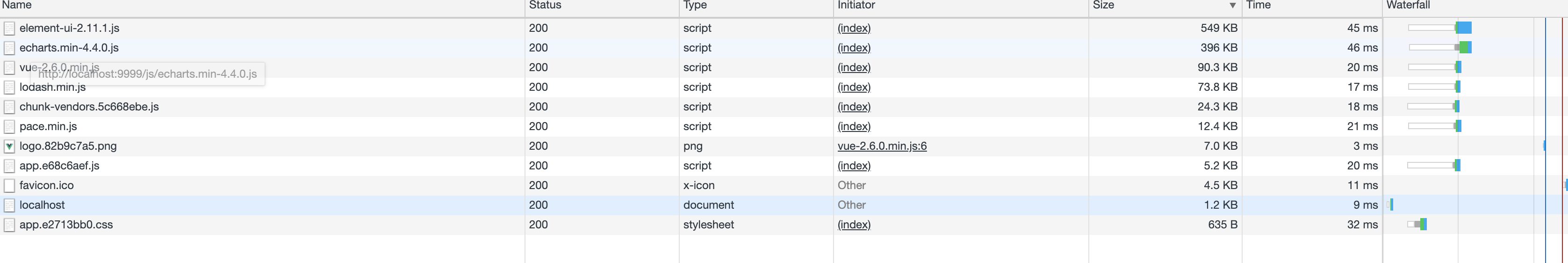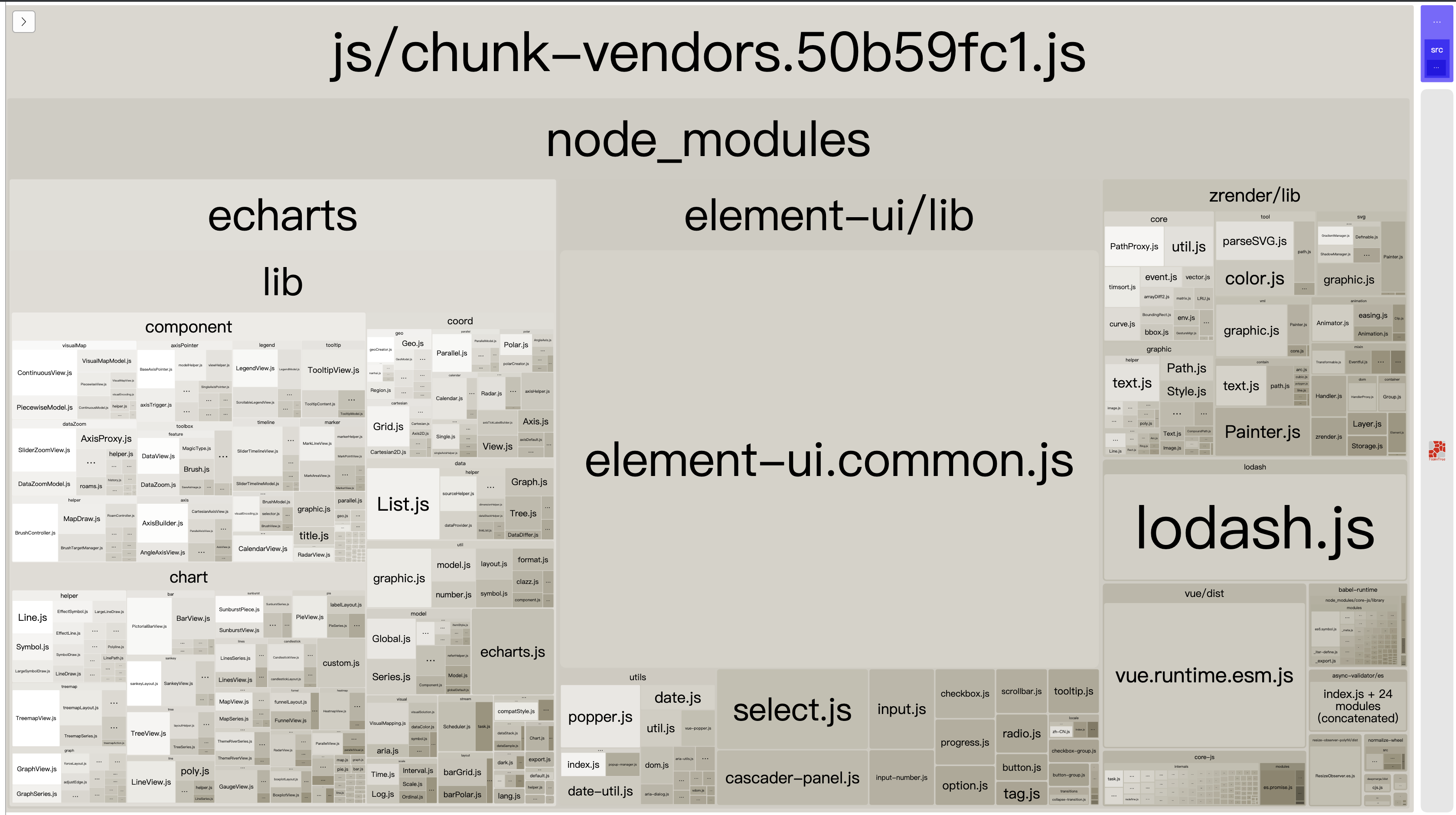 我们可以看到生成的最大文件为chunk-vendors.js,这个文件主要又由echarts、element-ui、lodash、zrender组成,其中echarts、element-ui、lodash为我们项目开发时必要引入的文件,所以我们如果把这写文件分离出来那么文件自然就会小了很多