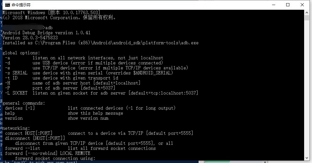 安装这些包需要很长时间,如果你是在学校的话,emmm,你可以晚上睡觉的时候安装,因为安装的时候电脑会卡卡的,所以也不能做其他事(比如写博客) - 安装完后,重新打开cmd,运行 adb 命令测一下有没有安装成功。