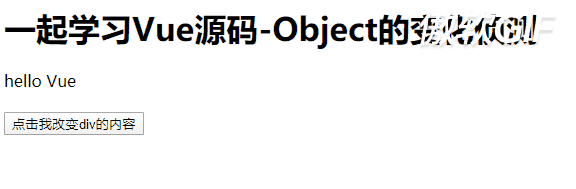 <head> <meta charset="utf-8" /> <title>一起学习Vue源码-Object的变化侦测</title> </head> <body> <h1>一起学习Vue源码-Object的变化侦测</h1> <div id="box"> {{text}} </div> </body> <script type="text/javascript" src="./Dep.js"></script> <script type="text/javascript" src="./Observer.js"></script> <script type="text/javascript" src="./Watcher.js"></script> <script type='text/javascript'> /* * data: 数据 * el: 元素 * exp:对象的属性 * (传递这个exp固定参数也是因为没有模板编译相关的代码,所以就暂时写死一个属性) */ function Vue(data, el, exp){ this.data = data; this.el = el; // 因为没有模板相关的代码,所以{{text}}的值使用这种方式进行解析 this.innerHTML = this.data[exp]; } var data = { text: 'hello Vue' }; var el = document.getElementById('box'); var vm = new Vue(data, el); </script> </html>