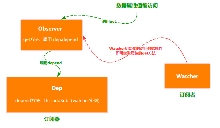 Watcher初始化的时候触发数据属性的get方法,将订阅者添加到订阅器中。