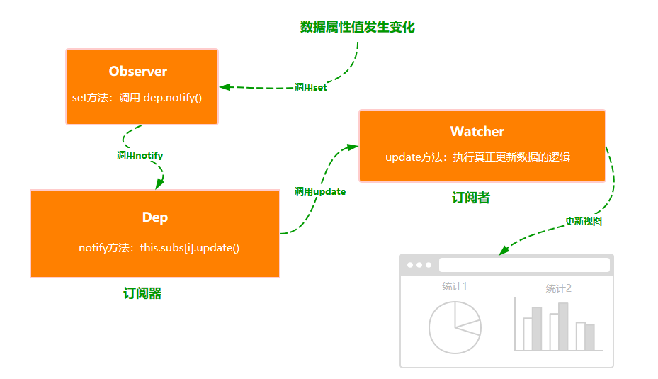 Dep.prototype.addSub = function(sub){ this.subs.push(sub); } // 添加依赖 Dep.prototype.depend = function() { // addSub添加的是一个订阅者/依赖对象 // Watcher实例就是订阅者,在Watcher实例初始化的时候,已经将自己保存到了Dep.target中 if(Dep.target){ this.addSub(Dep.target); } } // 移除依赖 Dep.prototype.removeSub = function(sub) { // 源码中是通过抽出来一个remove方法来实现移除的 if(this.subs.length > 0){ var index = this.subs.indexOf(sub); if(index > -1){ // 注意splice的用法 this.subs.splice(index, 1); } } } // 通知数据更新 Dep.prototype.notify = function() { for(var i = 0; i < this.subs.length; i++ ){ // 这里相当于依次调用subs中每个元素的update方法 // update方法内部实现可以先不用关注,了解其目的就是为了更新数据 this.subs[i].update() } }