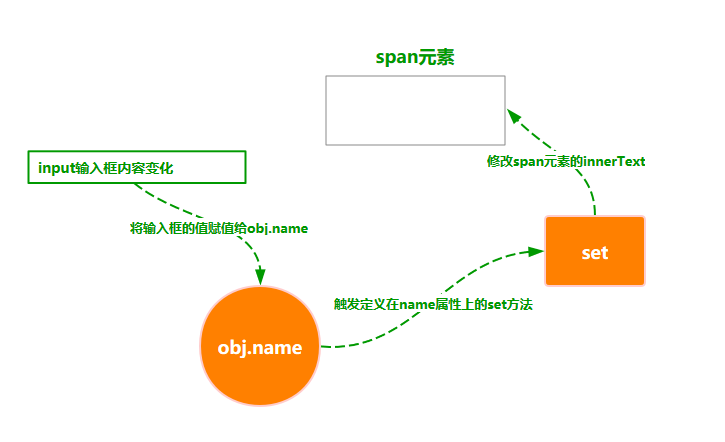<input type="text" id="name"/> <br/> <span id="text"></span> <script type="text/javascript"> var nameEle = document.getElementById("name"); var textEle = document.getElementById('text'); var obj = {}; Object.defineProperty(obj, 'name', { enumerable: true, configurable: true, get: function(){ return textEle.value; }, set: function(newName){ textEle.innerText = newName; } }) nameEle.onkeyup = function () { obj.name = event.target.value; } </script>