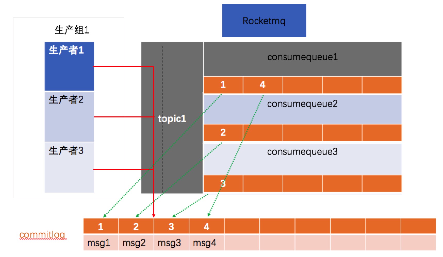也就是所有的消息体都写在了一个文件里面,每个ConsumeQueue只是存储这个消息在commitlog中地址。