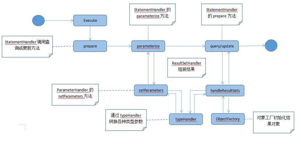 SqlSession处理SQL的过程:通过StatementHandler、ParameterHandler和ResultSetHandler来完成数据库操作和结果的返回。