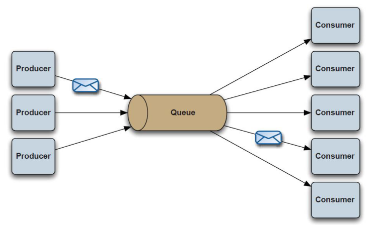 - 消息生产者生产消息发送到queue中,然后消息消费者从queue中取出并且消费消息。
