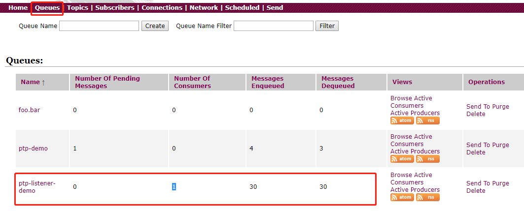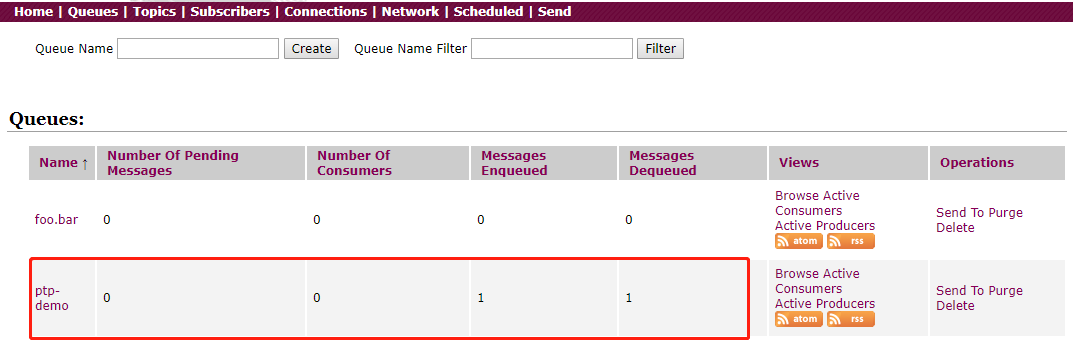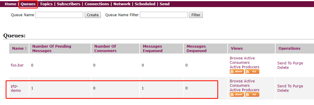 去看下控制台页面的变化,队列里面多了个“ptp-demo”队列,这个就是我们生产者代码里面的队列名,并且能看到该队列的基本情况: