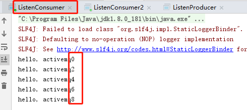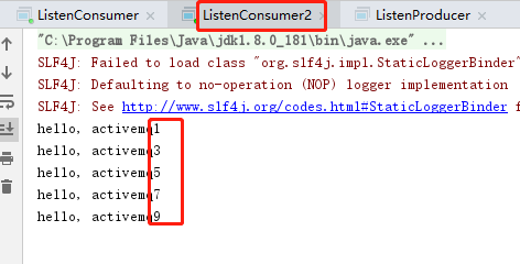 也就是说两个消费者都监听到了消息,并且activemq自动轮询两个监听器发送消息。