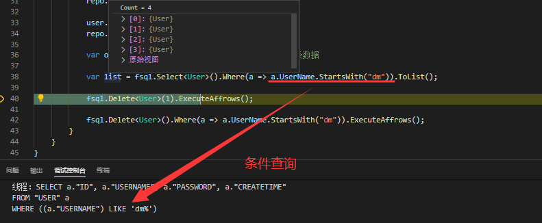 var list = fsql.Select<User>().Where(a => a.UserName.StartsWith("dm")).ToList();