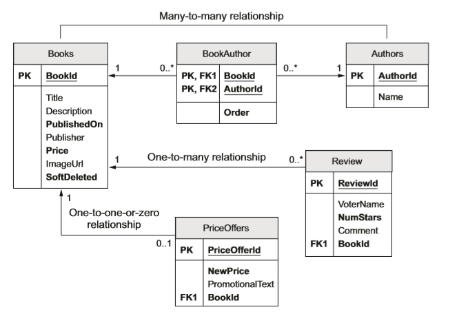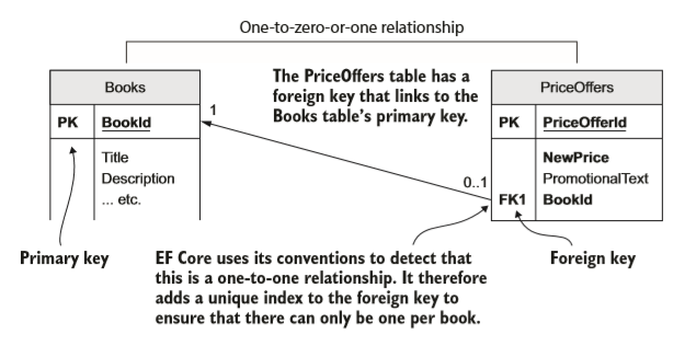 一个书可以有促销价格,这通过PriceOffers表的一个可选行实现的,这是一个一对一的例子(从技术来讲,这是一个1-0或1的关系,不过EF Core的处理方式是一样的);参见图2.1