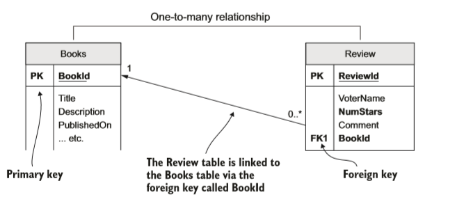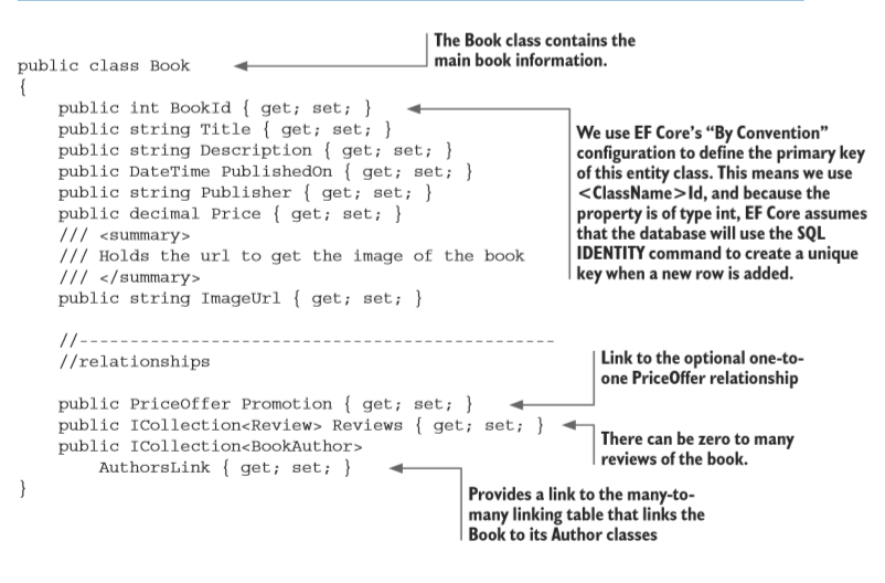 为了保持示例的简单,示例中使用了EF Core的约定配置方法对数据库建模. .Net类的导航属性(比如ICollection<Review>)定义了我需要关系类型,例如Reviews属性的类型是ICollection,所以是一对多关系. 第六章和第七章介绍了建模的其他方法