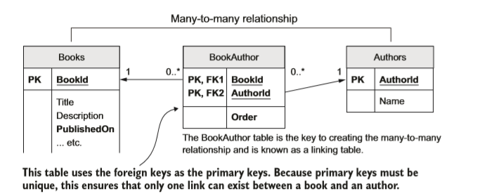 The BookAuthor table is the key to creating the many-to-many relationship and is known as a linking table