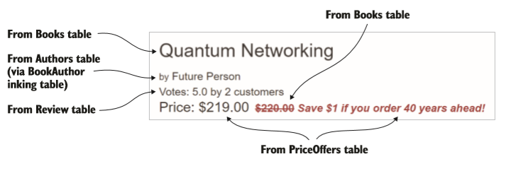 为了帮助理解,图2.5展示了图片列表的输出(只有一书本). 图书应用程序需要访问数据库中的每一张表来构建图书列表,后面我会使用代码进行查询显示