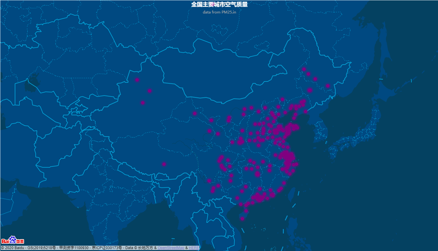 pyecharts 还支持百度地图上的一些操作,这对于需要使用地图做图的同学来讲不得不说是一个福音,比如下面的全国主要城市空气质量图: