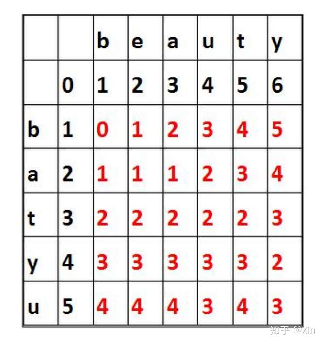 2、编辑距离的计算过程:比如要计算 batyu 和 beauty 的编辑距离,先创建一个 7×8 的表(batyu 长度为 5,coffee 长度为 6,各加 2),接着,在如下位置填入 黑色数字。其他格的计算过程是取以下三个值的最小值: