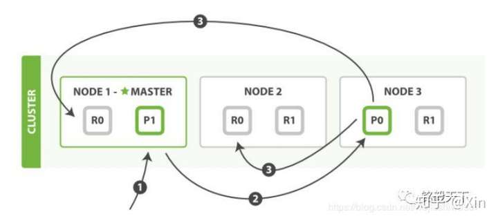 第二步:节点 1 接受到请求后,使用文档_id 来确定文档属于分片 0。请求会被转 到另外的节点,假定节点 3。因此分片 0 的主分片分配到节点 3 上。