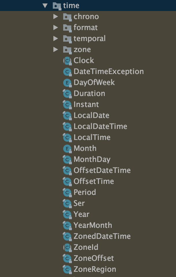 可以看到,除了一些日期、时间类之外,还有四个包:chrono、format、temporal、zone。先简略介绍下这四个包的用途。