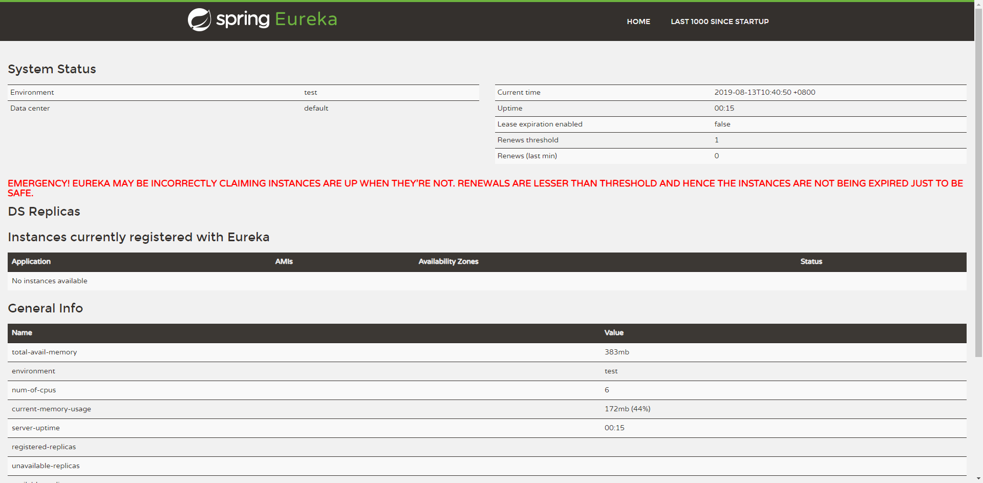启动工程后,访问:http://localhost:8080/,就能看到一个图形化的管理界面,目前没有注册任何服务。