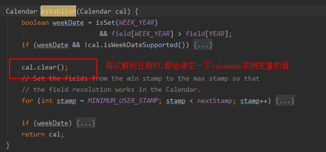 到此, 已经基本明了, 因为每次 SimpleDateFormat 解析日期时间都会清空一下它的成员变量 calendar 的值, 所以当多个线程并发访问同一个 SimpleDateformat 时, 就会有线程不安全问题。
