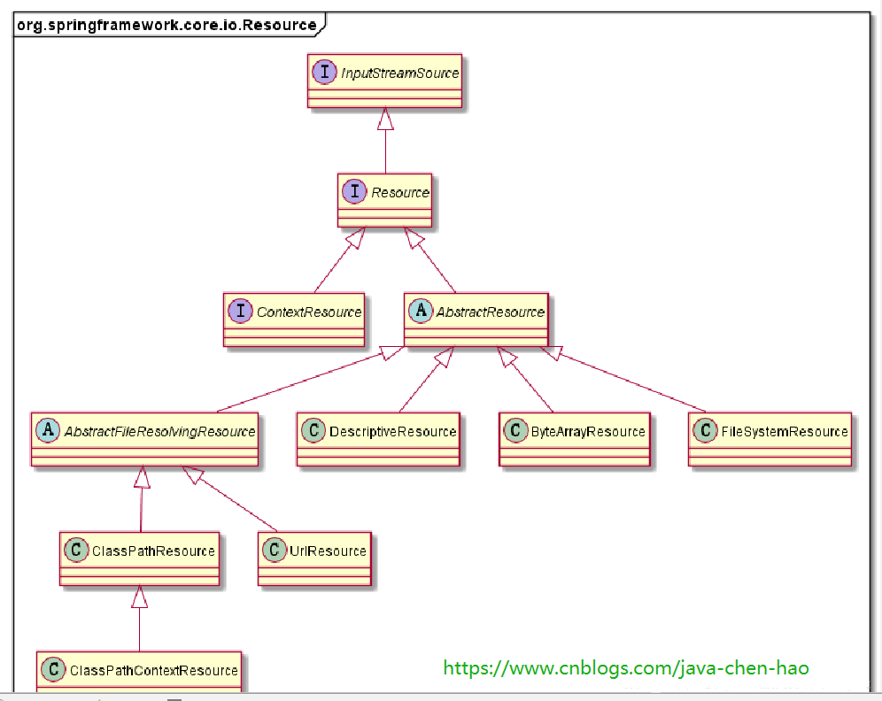Spring的配置文件读取是通过ClassPathResource进行封装的,Spring对其内部使用到的资源实现了自己的抽象结构:Resource接口来封装底层资源,如下源码: