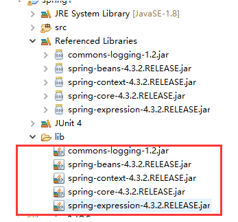 1.创建项目并导入jar包:将Spring的基础支撑包和依赖的日志包复制到lib文件下,并且加入项目中