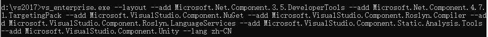 因此我们的指令是vs_enterprise.exe --layout --add Microsoft.Net.Component.3.5.DeveloperTools --add Microsoft.Net.Component.4.7.1.TargetingPack --add Microsoft.VisualStudio.Component.NuGet --add Microsoft.VisualStudio.Component.Roslyn.Compiler --add Microsoft.VisualStudio.Component.Roslyn.LanguageServices --add Microsoft.VisualStudio.Component.Static.Analysis.Tools --add Microsoft.VisualStudio.Component.Unity --lang zh-CN