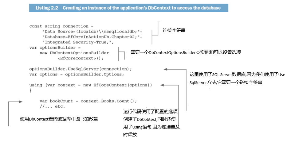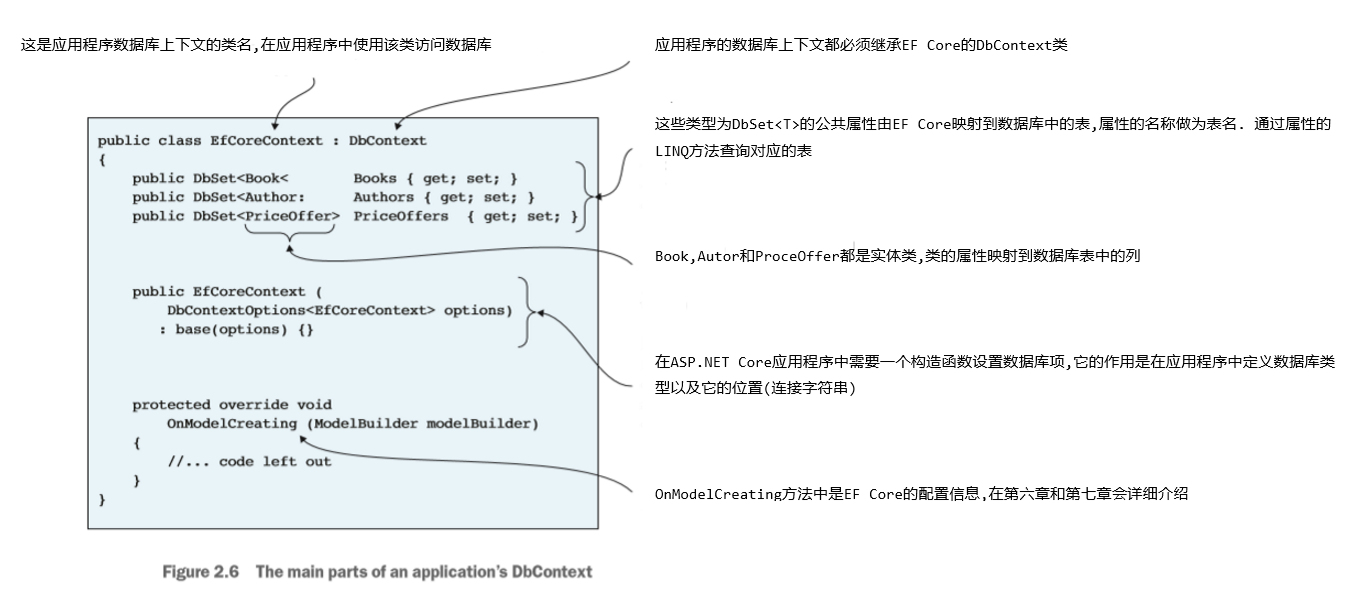 使用EF Core的关键类就是应用程序的DbContext,该类继承EF Core的DbContext类. 添加各种属性代表数据库中的表. 它还可以覆盖基类方法使用EF Core的其他功能,比如配置数据库建模等. 图2.6展示了应用程序数据库上下文的概述并指出了重要的部分