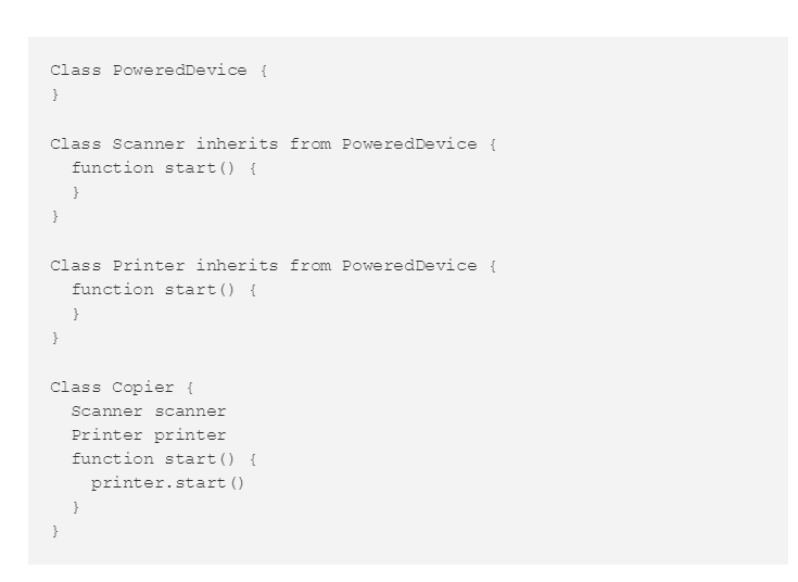 看到了吗,现在复印机类包含了一个打印机的实例和一个扫描仪的实例。它把“开始”方法委托给了打印机类去实现。当然,你也可以轻易的把它委托给复印机类。