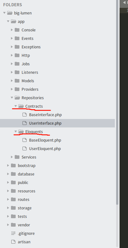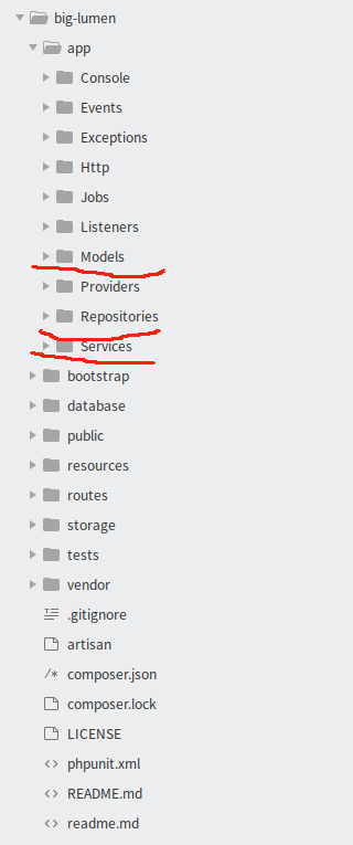 1.Lumen基础框架中,并不包含仓储层,与业务逻辑层,所以我们在app文件夹下,新建两个文件夹(Repositories、Services)。另外新建Models文件夹,用来存放数据源文件。