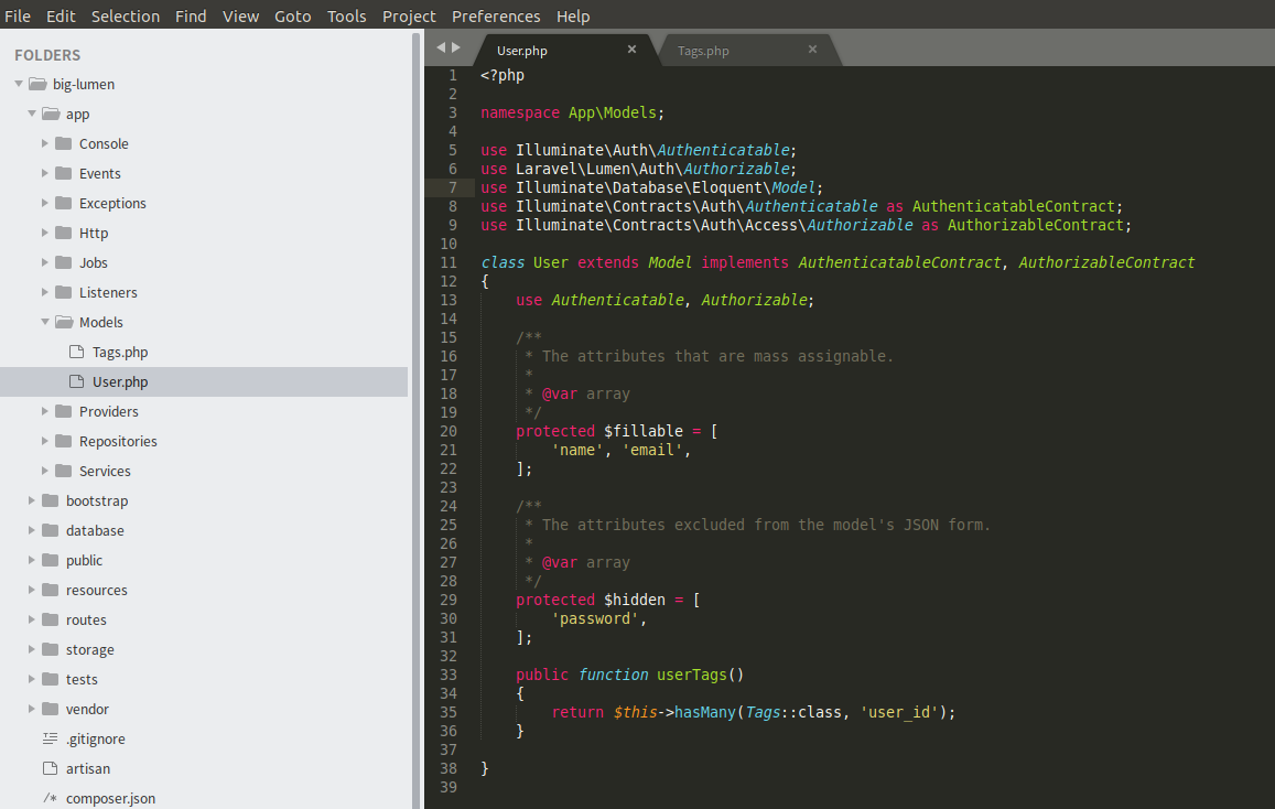 首先,我们在仓储层中,新建一个BASE接口文件(BaseInterface)与它的抽象类实现(BaseEloquent),可以在其中定义通用方法,具体参见我的代码库https://github.com/BusinessL/big-lumen。