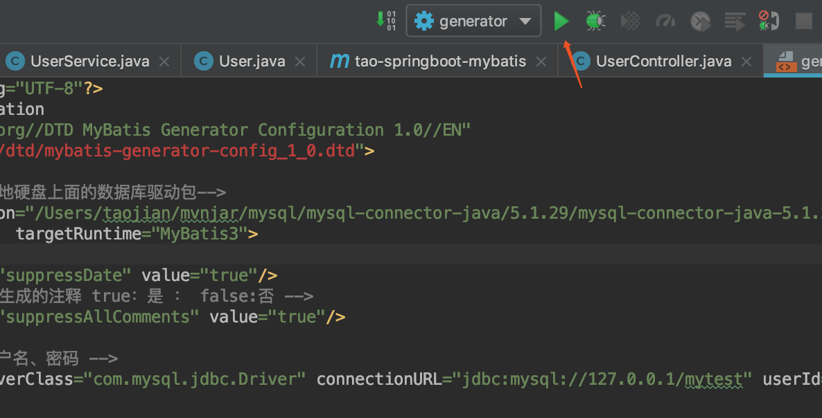 <jdbcConnection driverClass="com.mysql.jdbc.Driver" connectionURL="jdbc:mysql://127.0.0.1/mytest" userId="root" password="root">