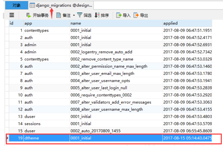其次,在数据库里面也有相应的记录,也要删除。我们仔细看看数据库里面存的是什么,在Django_migrations里面,这表里面存的都是每次迁移的记录,当然记录的是什么模块以及对应的文件名字,比如我们这里的模块是dtheme,这里的文件名叫做001_initial,和我们文件夹里面是一一对应的,同样,删除这条记录。
