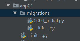 在该APP模块下,有一个migtations文件夹,除了前两个文件外,其他的文件都删除,其实每一次如果有变化的话,这边就会生成一个文件,下面的这个001_initial.py看名字就知道是第一次迁移的时候生成的,也就是因为有它的存在,所以以后每次再执行就不再创建表了。
