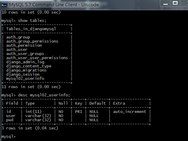 注意:如果这个APP模块下面还有其他的model的话,那么其他的model创建的表也要删除掉,相当于我们这样的解决方案是针对整个APP模块的,要执行就会全部重新生成,不然会提示部分表已经存在错误。